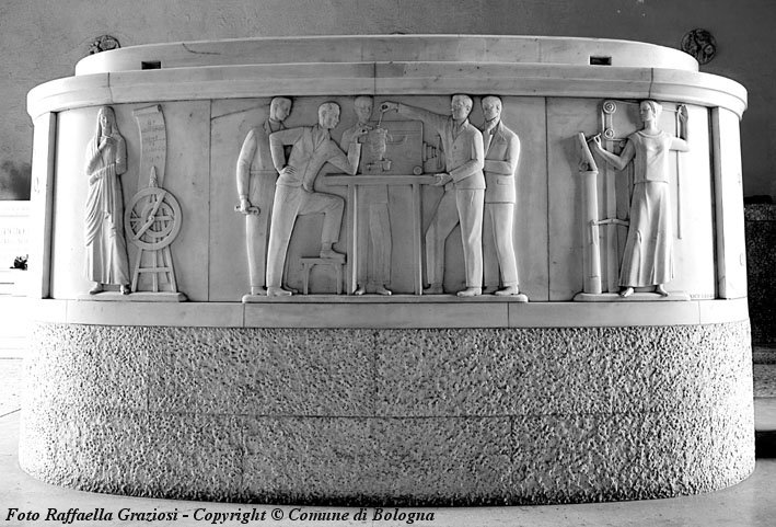 Descrizione: La tomba dedicata al grande industriale venne realizzata per volontà di Anna Bolelli in memoria del marito Edoardo Weber, fu progettata da Augusto Panighi e realizzata da Venanzio Baccilieri. E' composta da un sarcofago in marmo di Carrara a pianta ellittica, dinanzi al quale si trova un cippo con il busto raffigurante il defunto. Lungo il sarcofago sono collocati una serie di fregi rappresentanti episodi dell'industria fondata dall'ingegnere, che celebrano il tema del lavoro in modo concettuale. Con la sua connotazione purista, il fregio pone l’autore a contatto con quel clima realista tipico della pittura del periodo, lontana dalla retorica classicista.