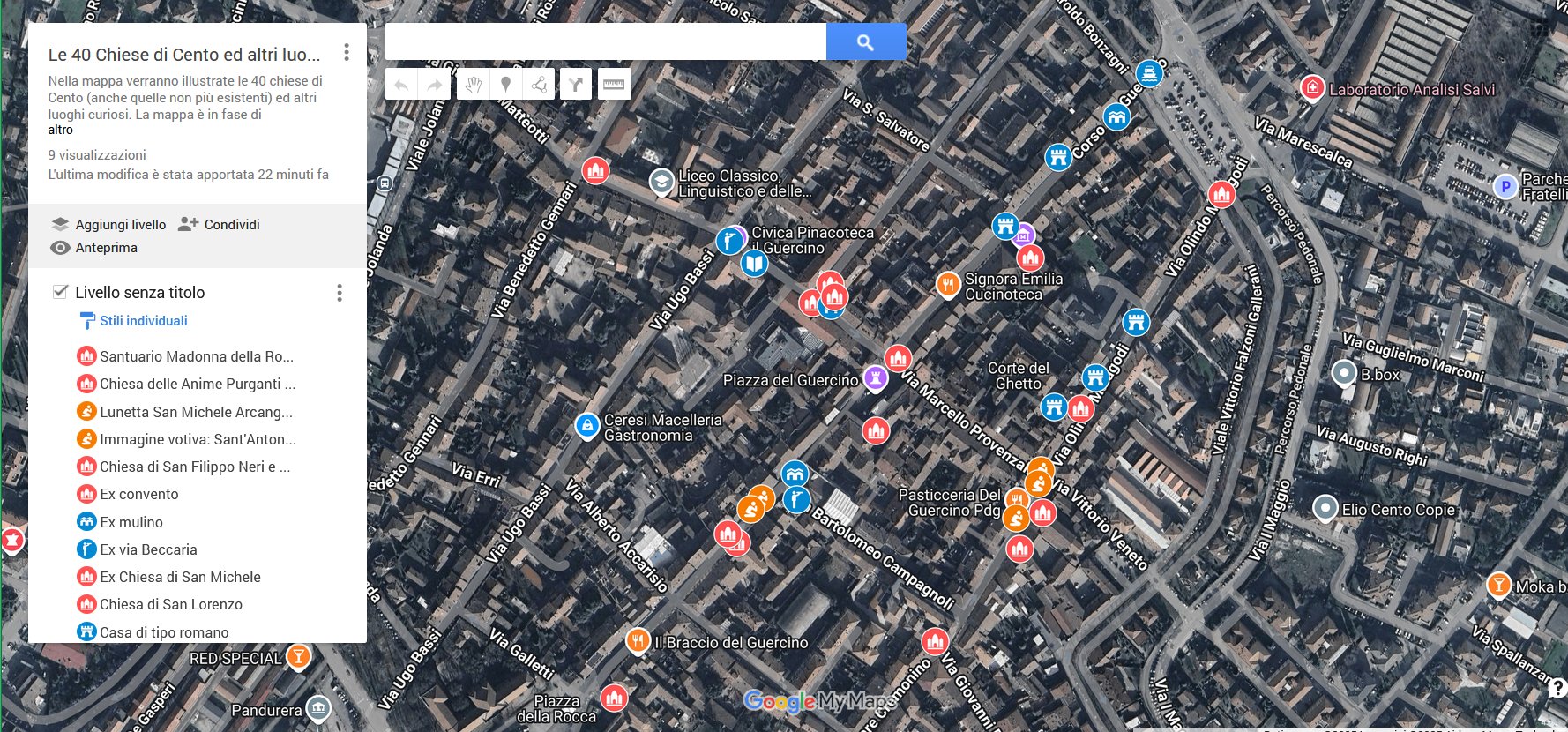 Nella mappa verranno illustrate le 40 chiese di Cento (anche quelle non più esistenti) ed altri luoghi curiosi. La mappa è in fase di aggiornamento, poiché le diverse tappe del percorso verranno scoperte attraverso più incontri nel corso del tempo.
