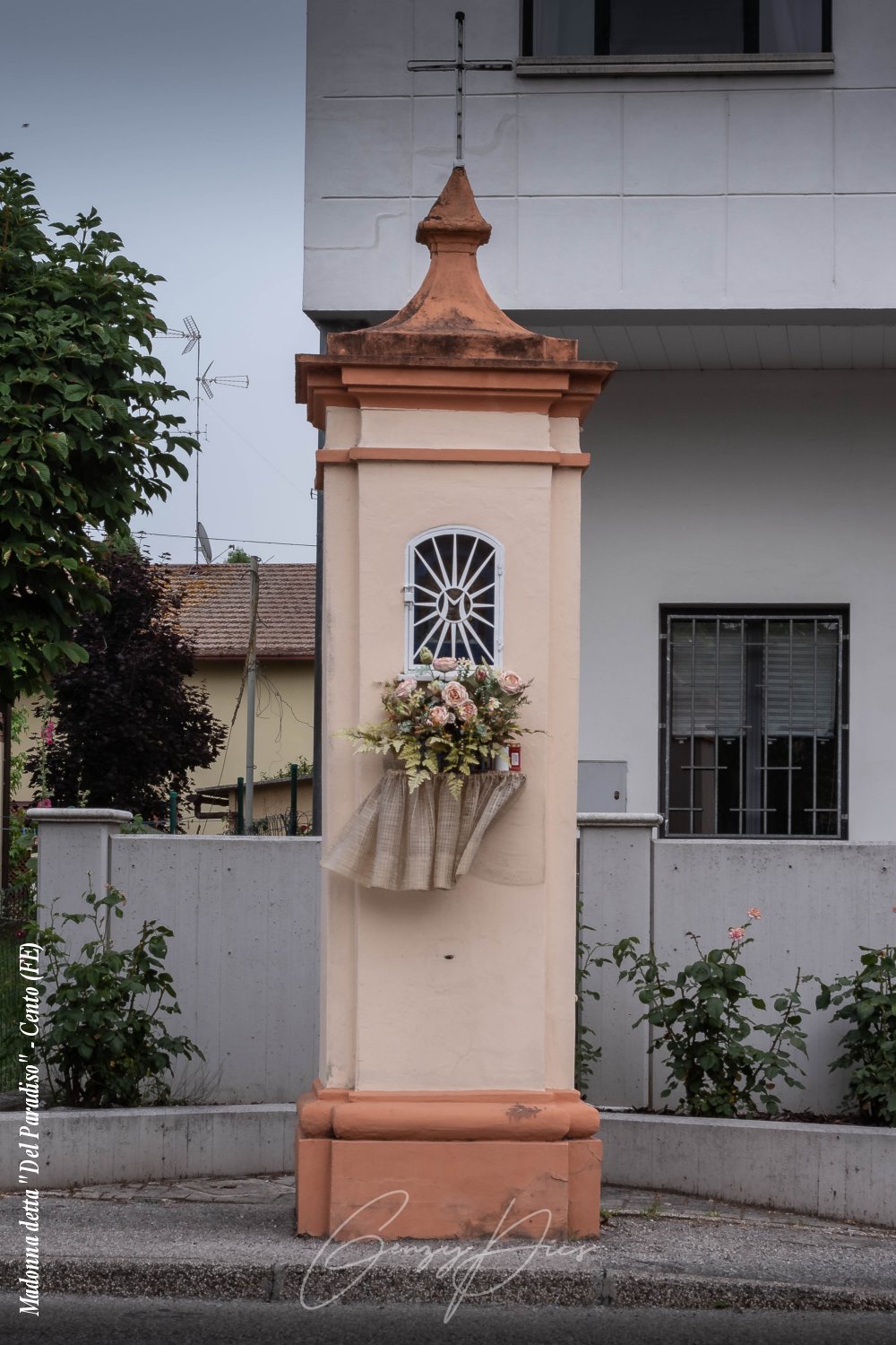 “Al Pilastren dal Paradis” è stato, in passato, un punto di riferimento per la devozione mariana del mese di Maggio di molti Centesi, quando costituiva un punto di aggregazione per la recita serale del S. Rosario. Per tutto il mese veniva applicata in cima al pilastrino una caratteristica “M” luminosa, che poi nel 1975 Dino Bonzagni riportò nel bozzetto del cancelletto.