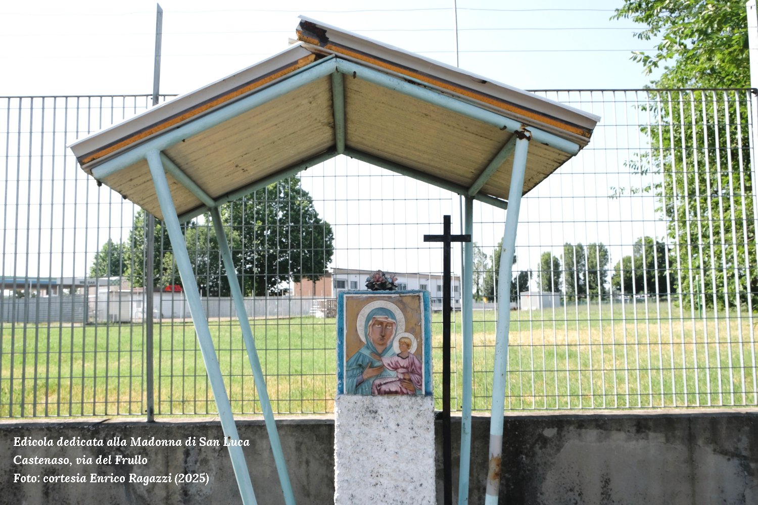Un'altra singolare espressione di devozione verso la Madonna di San Luca si trova a Castenaso in via del Frullo. L'edicola, caratterizzata da una struttura a capanna in legno e metallo dall'aspetto contemporaneo, protegge l'immagine sacra ed è stata realizzata con cura artigianale. Il manufatto presenta una base in cemento con un sentiero di accesso lastricato che conduce direttamente al sacello, testimoniando l'attenzione e la pianificazione nella sua costruzione. La presenza di fiori freschi e oggetti devozionali deposti ai piedi dell'immagine rivela come questa edicola sia ancora oggi oggetto di viva devozione popolare da parte della comunità locale.