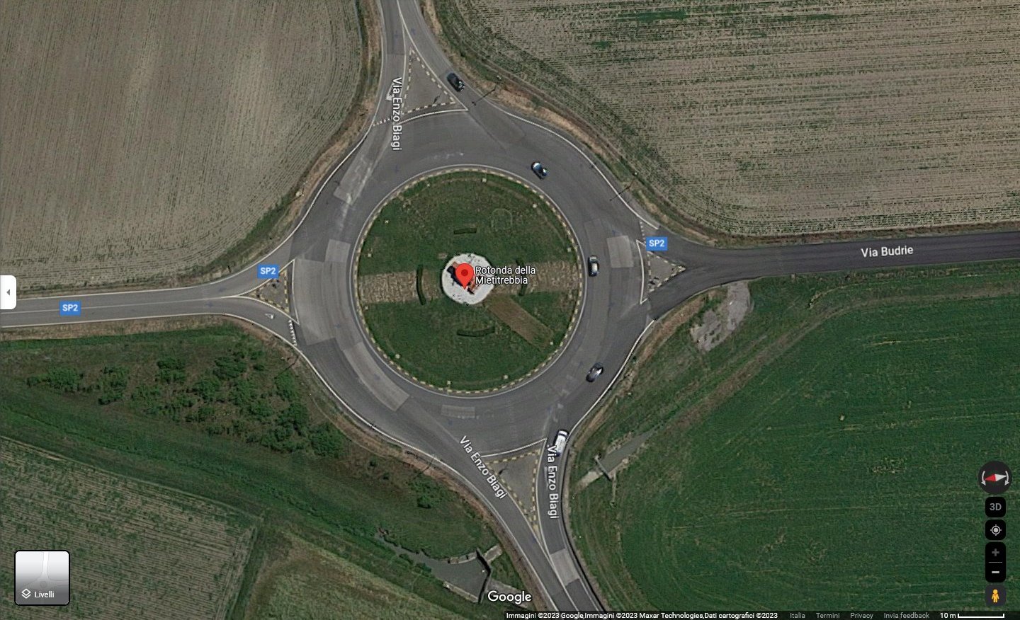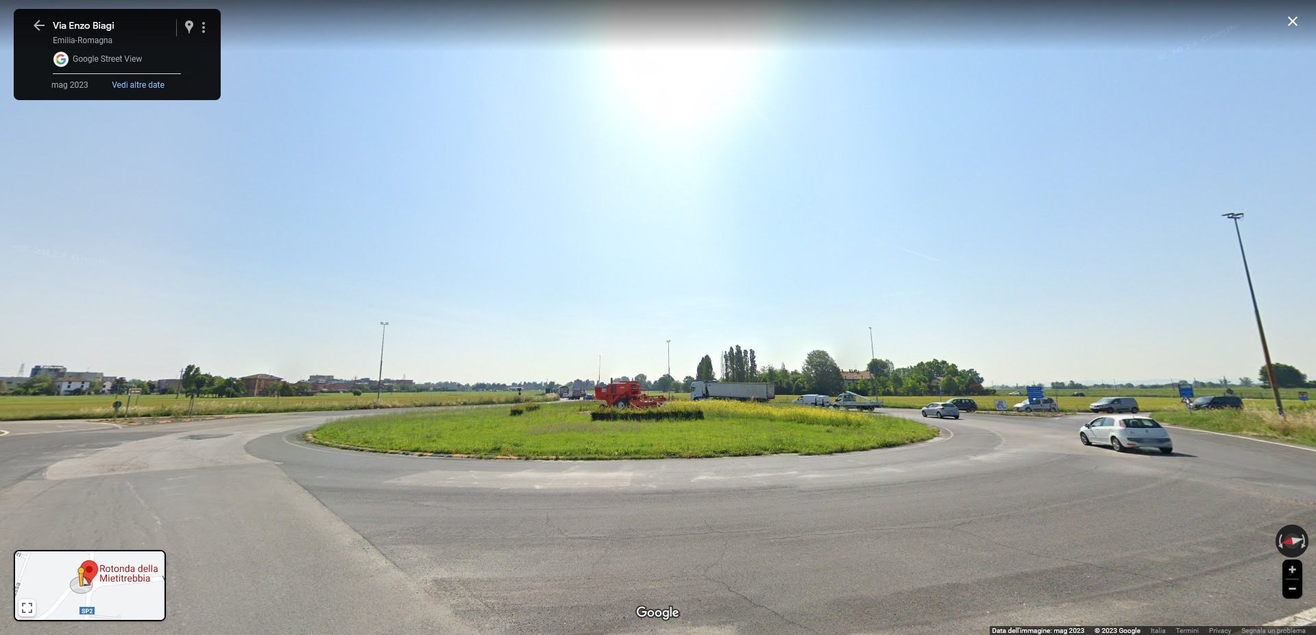 Descrizione: la rotatoria è situata sulla strada che collega il centro di San Giovanni in Persiceto con le campagne persicetane, quindi in una zona ancora intensamente coltivata.