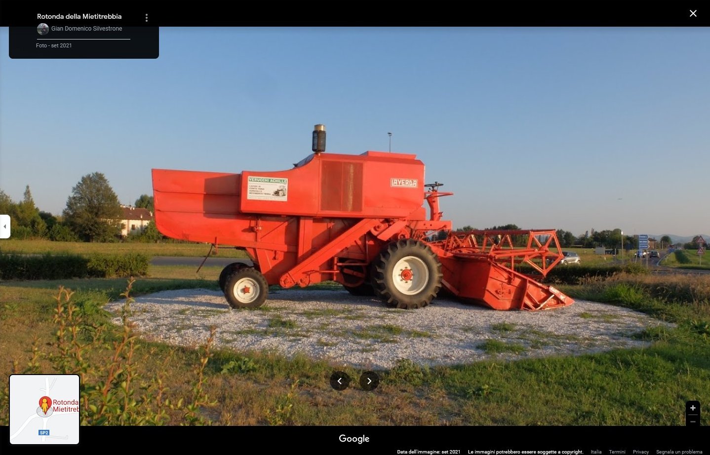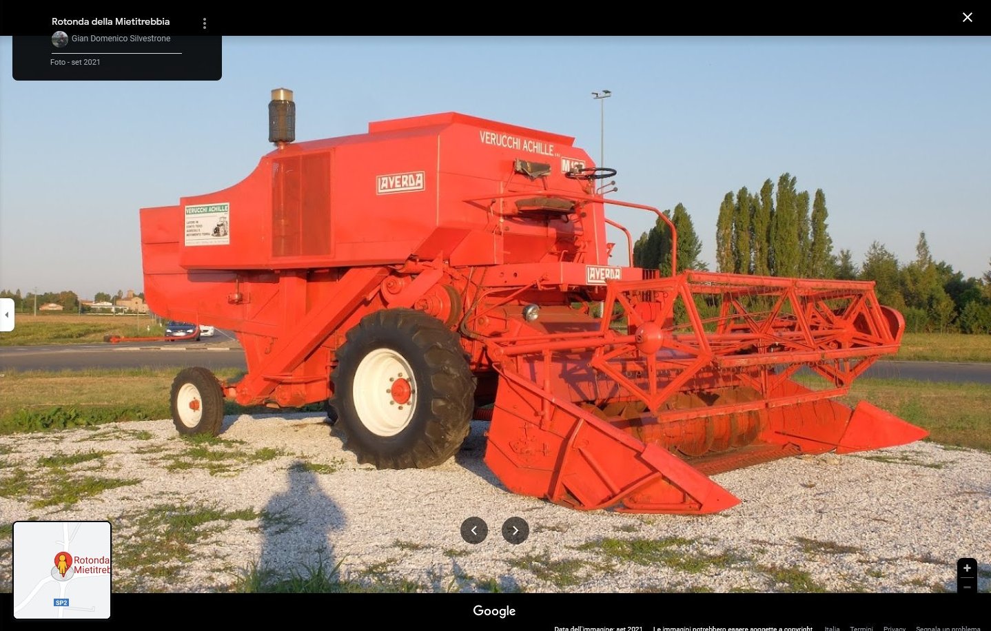 Al centro della rotonda è stata collocata una Mietitrebbia Laverda M120 fornita dall'azienda Verucchi Achille Snc di Anzola Emilia, importante realtà che opera da oltre 40 anni nel settore agricolo. Ci interessa fare notare che la macchina collocata al centro della rotatoria è un pezzo d'epoca, poiché venne prodotta dalla ditta di macchine agricole Pietro Laverda di Breganze (Vicenza)dal 1963 al 1975.