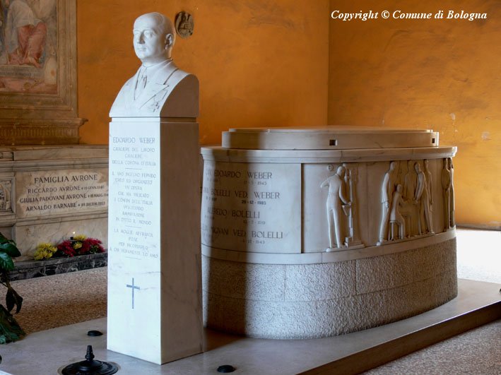Descrizione: La tomba dedicata al grande industriale venne realizzata per volontà di Anna Bolelli in memoria del marito Edoardo Weber, fu progettata da Augusto Panighi e realizzata da Venanzio Baccilieri. E' composta da un sarcofago in marmo di Carrara a pianta ellittica, dinanzi al quale si trova un cippo con il busto raffigurante il defunto. Lungo il sarcofago sono collocati una serie di fregi rappresentanti episodi dell'industria fondata dall'ingegnere, che celebrano il tema del lavoro in modo concettuale. Con la sua connotazione purista, il fregio pone l’autore a contatto con quel clima realista tipico della pittura del periodo, lontana dalla retorica classicista.
