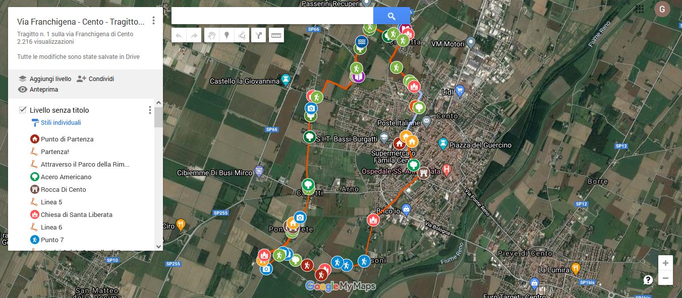 Il Tragitto sulla via Franchigena di Cento è un percorso ideato da Franco Grandi, centese doc ed appassionato di storia locale. Con la collaborazione dell'Associazione Crocetta Onlus, ogni prima domenica del mese (escludendo luglio, agosto e dicembre) Franco Grandi ci porta alla scoperta delle bellezze del circondario centese, fra natura, religiosità popolare ed altre curiosità storiche.