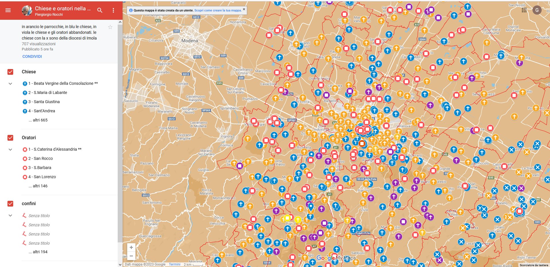 In arancio le parrocchie, in blu le chiese, in viola le chiese e gli oratori abbandonati. Le chiese con la X sono della Diocesi di Imola.
