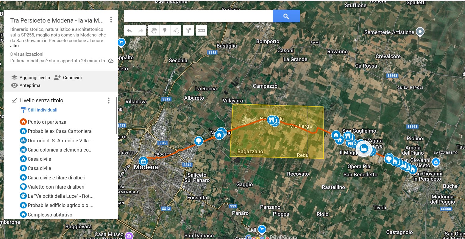 Itinerario storico, naturalistico e architettonico sulla SP255, meglio nota come via Modena, che da San Giovanni in Persiceto conduce al cuore della Motor Valley, attraverso campagne disseminate di case coloniche, antiche dimore, borghi rivieraschi.