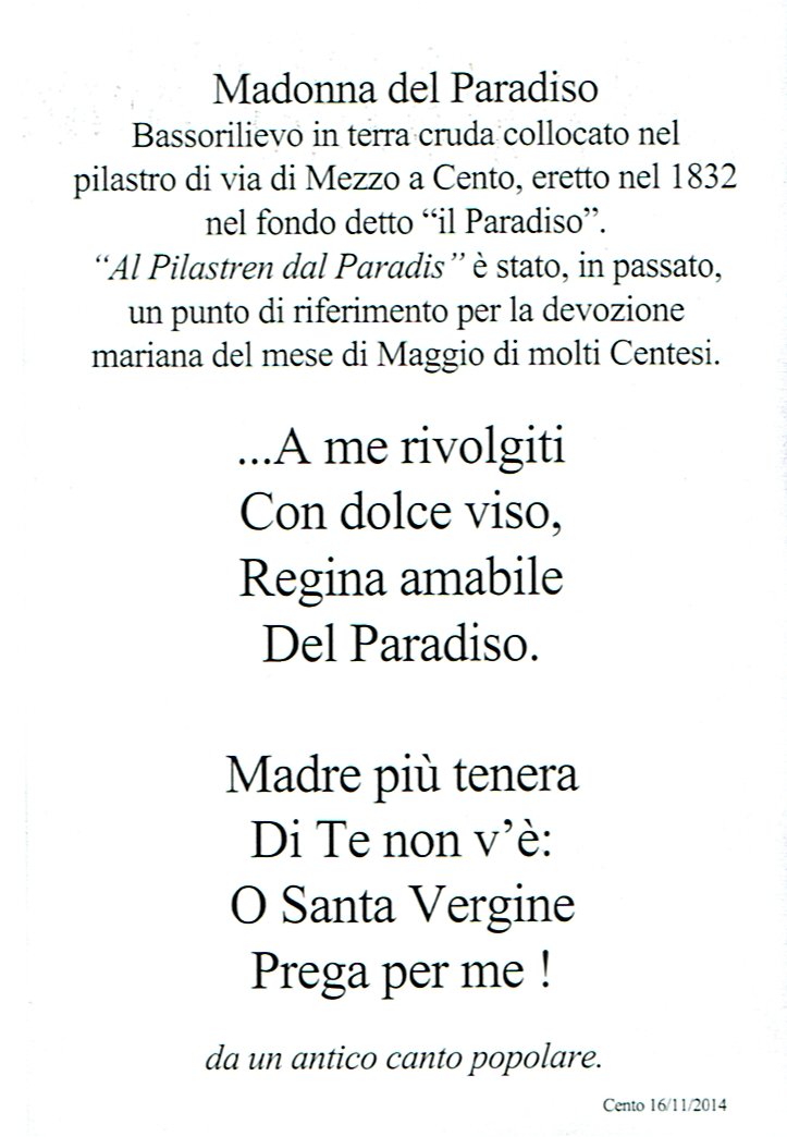 “Al Pilastren dal Paradis” è stato, in passato, un punto di riferimento per la devozione mariana del mese di Maggio di molti Centesi, quando costituiva un punto di aggregazione per la recita serale del S. Rosario. Per tutto il mese veniva applicata in cima al pilastrino una caratteristica “M” luminosa, che poi nel 1975 Dino Bonzagni riportò nel bozzetto del cancelletto.