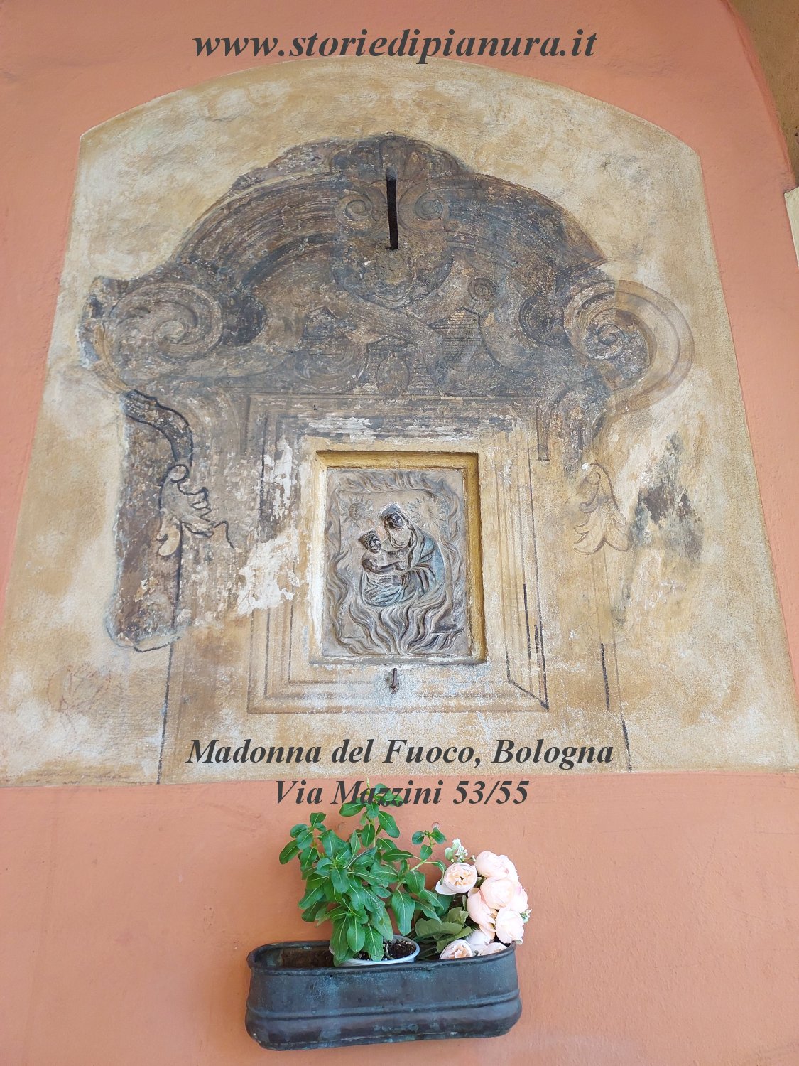 Descrizione: l'antica formella in cotto inserita nel muro del sottoportico di via Mazzini a Bologna, ancora ben conservata, riprende l'iconografia della xilografia su carta di Forlì, ma con l'immagine sacra avvolta dalle fiamme. Questo elemento aggiuntivo la connota notevolmente, essendo la formella collocata lontano dalla città di Forlì. All'interno delle fiamme sono la Vergine, il Bambino, ed appena dietro il Sole e la Luna. Alla formella fa da cornice una pittura che la impreziosisce rendendola più monumentale. Un tempo dall’alto pendeva una lampada ad olio, sostituita oggi dai numerosi lumini che tanti accendono ai suoi piedi. Non sappiamo il nome del suo autore e nemmeno il motivo della sua collocazione in questo tratto di portico. E’ logico supporre che il proprietario di questo edificio fosse un forlivese e che intendesse conservare a Bologna la venerazione di quella Madonna alla quale era tanto affezionato.